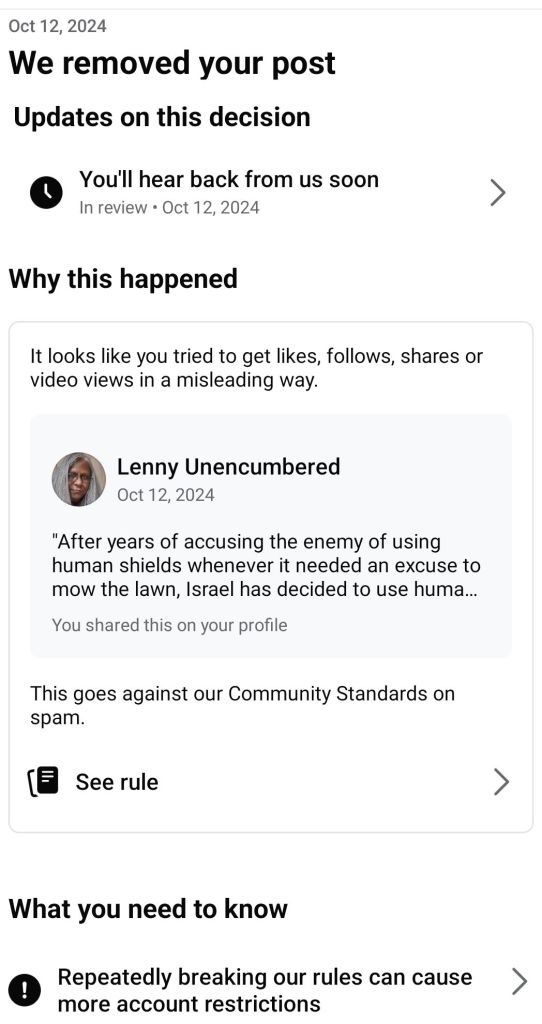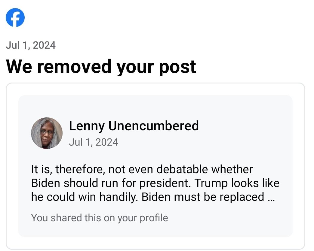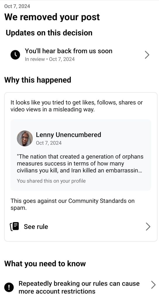 Recently, I, like many others, have had posts sympathetic to the Palestinian plight on platforms like Facebook taken down. I’m now on Strike 3 and face a temporary or permanent ban. The latter posts were Substack articles I shared that were meant to pass on factual information. At the same time, the first was an opinion which turned out to be right on the mark – President Joe Biden was replaced by Kamal Harris as presidential candidate a short while after I made that observation. While my appeal in the first case was rejected, I have not heard back from the moderators on the other two.