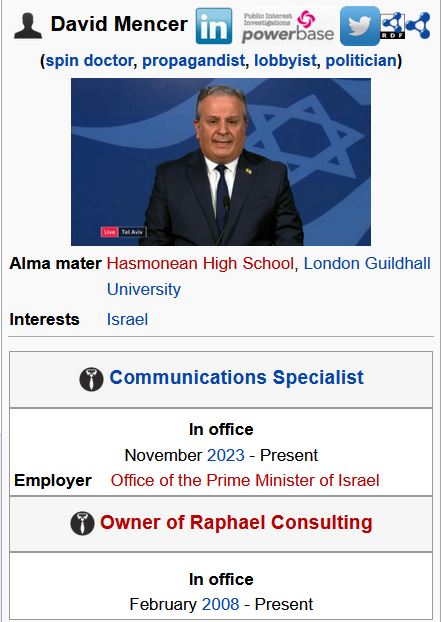 Wikispooks lists Mencer as a “spin doctor, propagandist, lobbyist, politician.” It’s clearly in that specific order because he fails spectacularly in proficiency from left to right. While his lies are transparent and desperate, watching him spin the latest Israeli war crime on mainstream media has become nauseating.