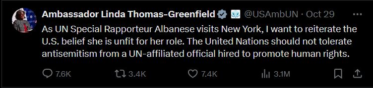 Just recently, the US Ambassador to the UN, Linda Thomas-Greenfield, a distinctly unlikeable woman who has become infamous for vetoing ceasefire resolutions, couldn’t contain her urge to employ the smear. She posted a repulsive tweet on X, smearing UN Special Rapporteur on the Occupied Palestine Territories, Francesca Albanese, as antisemitic.