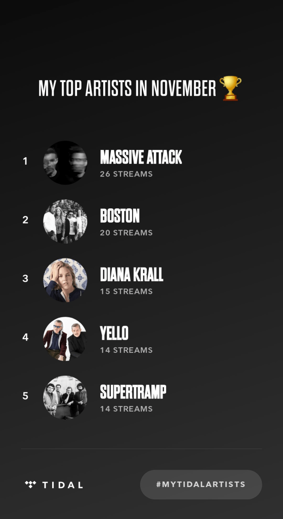 My Tidal streaming report for November features all well-known artists. The lesser-known artists didn’t make it into the top five, probably because I only listen to one or two audiophile-quality songs from them during the month.