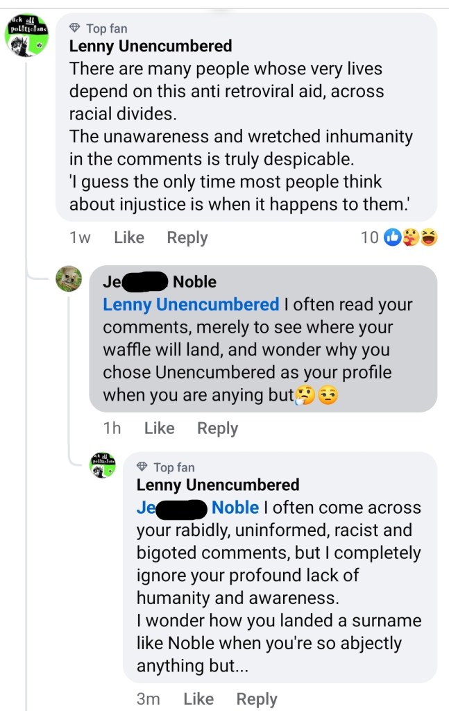 Like this regular commenter in response to me expressing disdain at the heartlessness being displayed by bigoted South Africans when Trump threatened to cut aid to us.