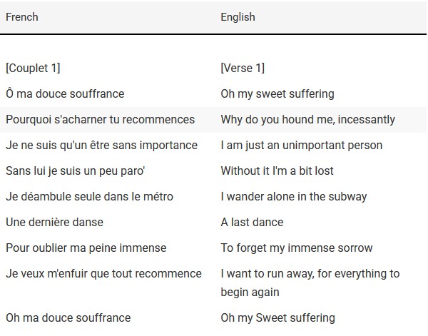 There’s something about the French language that’s not just seductive, but stirring, like their national anthem. Dernière Danse is pure poetry as can be seen from the first verse alone:
