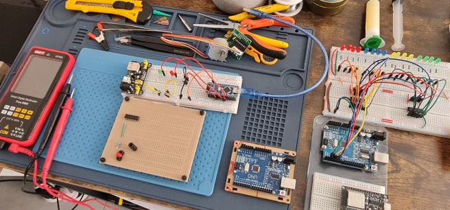 Anyway, not only did I decide to learn a new skill, but I also managed to find one. I am currently learning how to code using a variation of the C++ programming language, designed for Arduino development boards, to control electronic components. It’s early days, and I’m still a little disorganised as this photograph of my workbench demonstrates.